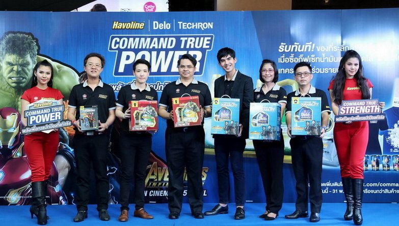 นายสันติศักดิ์ ไทยพัฒน์ ผู้จัดการทั่วไปธุรกิจผลิตภัณฑ์น้ำมันหล่อลื่นประเทศไทย บริษัท เชฟรอน (ไทย) จำกัด (ที่ 5 จากขวา) เจ้าของแบรนด์น้ำมันเครื่องคาลเท็กซ์ ฮาโวลีน, คาลเท็กซ์ เดโล่, และผลิตภัณฑ์เทครอนสำหรับเครื่องยนต์เบนซิน และดีเซล ร่วมกับ ภาพยนตร์ฟอร์มยักษ์สุดยิ่งใหญ่แห่งปีอเวนเจอร์ส: อินฟินิตี้ วอร์ มหาสงครามล้างจักรวาล Avengers: Infinity War เปิดตัวกิจกรรมพิเศษภายใต้แคมเปญการตลาด “COMMAND TRUE POWER: พลังเพื่อการปกป้องที่แท้จริง” เพื่อคืนกำไรให้แก่ผู้บริโภค พร้อมส่งตรงความบันเทิงถึงลูกค้าผลิตภัณฑ์คาลเท็กซ์ทั่วไทยกับประสบการณ์ความสุขเหนือระดับ โดยมีผู้บริหารทีมงานจากเชฟรอน และเต๋อ-ฉันทวิชช์ ธนะเสวี ร่วมงาน ณ ศูนย์การค้าสยามสแควร์วัน