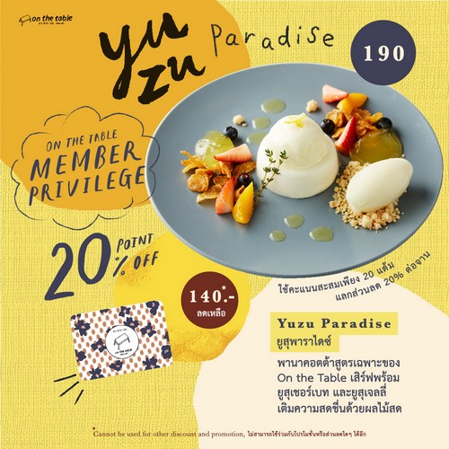 ปิดท้ายมื้อพิเศษด้วยเมนูของหวานอย่าง ยูสุพาราไดซ์ (190 บาท) พานาคอตต้าสูตรเฉพาะของ On the Table เสิร์ฟพร้อมไอศครีมยูสุเชอร์เบทและยูสุเจลลี่ ให้รสเปรี้ยวตัดหวานอย่างลงตัว เติมความสดชื่นยิ่งขึ้นด้วยผลไม้สด และพิเศษยิ่งขึ้นสำหรับลูกค้าที่เป็นสมาชิกบัตร On the Table เพียงใช้คะแนนสะสม 20 แต้ม และรับส่วนลดเมนูยูสุพาราไดซ์ ได้ในราคาเพียง 140 บาทเท่านั้น