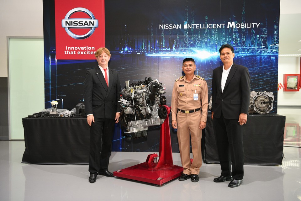 บริษัท นิสสัน มอเตอร์ (ประเทศไทย) จำกัด นำโดย มร. ปีเตอร์ แกลลี (ซ้าย) รองประธาน สายงานสื่อสารองค์กร มอบเกียร์และส่วนประกอบรถยนต์ให้แก่ ดร.วีระยุทธ สุดสมบูรณ์ (ขวา) คณะเทคโนโลยีอุตสาหกรรม มหาวิทยาลัยราชภัฏนครศรีธรรมราช และ นาวาเอก อุกฤช เถาว์ชาลี (กลาง) หัวหน้าแผนกจัดแผนงาน กองโรงงาน กรมการขนส่งทหารเรือ กองทัพเรือ เพื่อต่อยอดการสนับสนุนการเรียนรู้ของนักศึกษาและบุคลากรของหน่วยงานรัฐบาลผ่านการศึกษาส่วนประกอบต่าง ๆ ของรถยนต์เชิงปฏิบัติในสถานการณ์เสมือนจริง โดยการส่งมอบในครั้งนี้ถือเป็นส่วนหนึ่งของความร่วมมืออันต่อเนื่องระหว่างนิสสัน มหาวิทยาลัยราชภัฏนครศรีธรรมราช และกองทัพเรือไทย เพื่อส่งเสริมพัฒนาทักษะและการเรียนรู้ของนักศึกษาคณะเทคโนโลยีอุตสาหกรรมและทหารช่าง