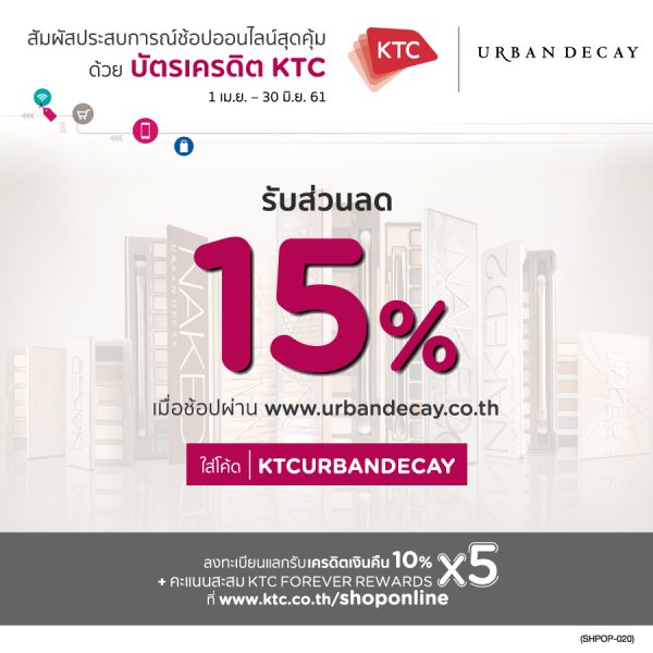 “เคทีซี” หรือ บริษัท บัตรกรุงไทย จำกัด (มหาชน) ร่วมกับ “เออเบิน ดีเคย์” (Urban Decay) มอบสิทธิพิเศษถึง 3 ต่อ เมื่อสมัครสมาชิกเพื่อซื้อผลิตภัณฑ์เมคอัพ Urban Decay ผ่านเว็บไซต์ www.urbandecay.co.th และชำระด้วยบัตรเครดิตเคทีซี พร้อมระบุรหัส ‘KTCURBANDECAY’ โดยจะได้รับส่วนลด 15% สำหรับสินค้าที่ร่วมรายการ ตั้งแต่วันนี้ – 30 มิถุนายน 2561 พร้อมรับเครดิตเงินคืนจากเคทีซีอีก 10% เมื่อใช้คะแนนสะสมเท่ากับยอดซื้อต่อรายการ และรับคะแนนสะสม KTC FOREVER REWARDS 5 เท่าเพียงลงทะเบียนที่ www.ktc.co.th/shoponline ตั้งแต่วันที่ 1 มกราคม – 31 สิงหาคม 2561