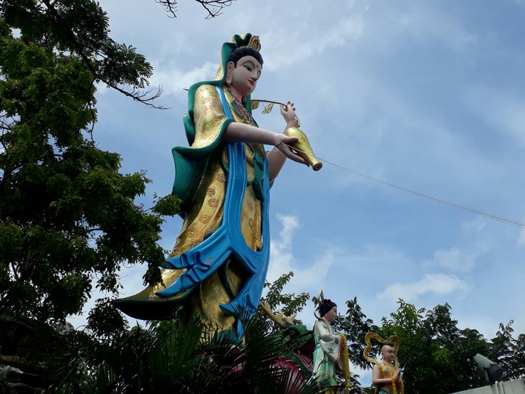 เริ่มจากตรงข้ามวัดช่องลมที่สะดุดตาสุดน่าจะเป็นอุทยานพระโพธิสัตว์กวนอิมซึ่งทุกเดือนพฤศจิกายน จะมีงานนมัสการเจ้าแม่กวนอิม จะเป็นช่วงใกล้ ๆ กับงานปลาทูที่ท่าฉลอม และเมื่อเดินมาถึงถนนถวาย ก็จะพบกับศาลเจ้าพ่อกวนอู ที่ตัวศาลมีลวดลายศิลปะจีนอันงดงาม ต่อด้วยศาลเจ้าโรงเจเซงเฮยงตัว ที่มีความเก่าแก่บนถนนแห่งนี้ติดกับศาลเจ้าแม่ทับทิม สองฟากข้างถนนก็มีร้านอาหารเก่าแก่ให้ได้แวะชม อาทิ ก๋วยเตี๋ยวเป็ดสูตรดั้งเดิม โรงกะปิ ที่มีตัวอาคารเหมือนบ้านของชาวลาวซ้ง