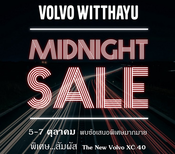 “จีที ออโต้” จัดแคมเปญ “Midnight Sale” ฉลองเปิดโชว์รูมวอลโว่วิทยุ พบข้อเสนอสุดพิเศษ เมื่อจองรถยนต์ Volvo ทุกรุ่น (สีและรุ่นที่มีจำหน่าย) รับทันทีของกำนัลมูลค่าสูงสุด 50,000 บาท พร้อมแพ็คเกจซ่อมบำรุงและดูแลแบบเบ็ดเสร็จ (Volvo 5-Year All-Inclusive) หรือนำ Volvo คันเก่ามาแลกคันใหม่รับส่วนลดสูงสุด 100,000 บาท พร้อมทั้งเปิดประสบการณ์สัมผัส The new Volvo XC40 ภายในงาน นอกจากนี้ยังมีกิจกรรม “Midnight Test Drive” ให้ลูกค้าได้ทดลองขับจนถึงเที่ยงคืนระหว่างวันที่ 5-7 ตุลาคมนี้ ที่โชว์รูมรถยนต์ Volvo Witthayu ถนนวิทยุ เท่านั้น เงื่อนไขเป็นไปตามที่บริษัทกำหนด สอบถามโทร.0-2251-8111