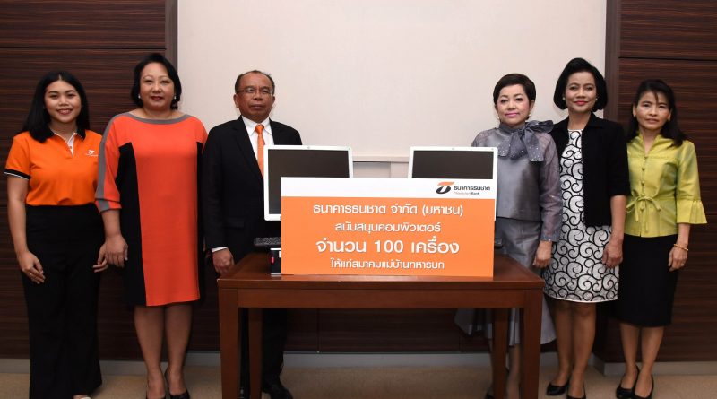 ธนาคารธนชาต จำกัด (มหาชน) นำโดย นายเกรียงไกร ภูริวิทย์วัฒนา ผู้ช่วยกรรมการผู้จัดการ (ที่ 3 จากซ้าย) สำนักประธานกรรมการบริหารและประธานเจ้าหน้าที่บริหาร ธนาคารธนชาต จำกัด (มหาชน) มอบคอมพิวเตอร์ที่ใช้แล้วแต่ยังสภาพดี จำนวน 100 เครื่อง แก่ สมาคมแม่บ้านทหารบก โดยมี นางเบญจวรรณ สิทธิสาท (ที่ 4 จากซ้าย) นายกสมาคมแม่บ้านทหารบกเป็นตัวแทนรับมอบ วัตถุประสงค์เพื่อใช้ในศูนย์การเรียนรู้และพัฒนาศักยภาพ รวมถึงเพิ่มโอกาสในการเข้าถึงข้อมูลที่เป็นประโยชน์แก่บุคลากรผ่านเทคโนโลยีสารสนเทศ โดยงานดังกล่าวจัดขึ้น ณ ห้องประชุมชั้น 2 สมาคมแม่บ้านทหารบก สโมสรกองทัพบก