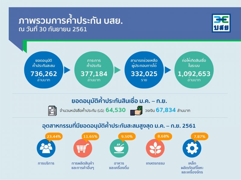 นางนิภารัตน์ พิสิฐพิทยเสรี รักษาการแทนผู้จัดการทั่วไป บรรษัทประกันสินเชื่ออุตสาหกรรมขนาดย่อม (บสย.) เปิดเผยว่า ผลดำเนินงาน 3 ไตรมาส (ม.ค. – ก.ย.) ปี 2561 บสย. สามารถช่วยผู้ประกอบการ SMEs ผ่านการค้ำประกันสินเชื่อ 67,834 ล้านบาท คิดเป็นจำนวนหนังสือค้ำประกัน (LG) 64,530 ฉบับ นอกจากนี้ บสย.ยังเดินหน้าเปิดตัว 2 โครงการใหม่ ซึ่งได้รับการอนุมัติจากคณะรัฐมนตรี (ครม.) เมื่อวันที่ 24 กรกฎาคมที่ผ่านมา ได้แก่ โครงการค้ำประกันสินเชื่อ SMEs ทวีทรัพย์ (PGS7) วงเงิน 150,000 ล้านบาท และโครงการค้ำประกันสินเชื่อรายย่อยสร้างอาชีพ (MICRO3) วงเงิน 15,000 ล้านบาท ซึ่งปัจจุบันได้รับการตอบรับที่ดีจากธนาคารพันธมิตร ในการปล่อยสินเชื่อ โดยมี บสย.ค้ำประกันฯ ผ่าน 2 โครงการดังกล่าวเป็นจำนวนมาก