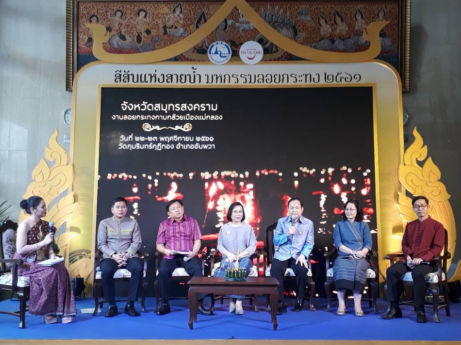 นางสุจิตรา จงชาณสิทโธ รองผู้ว่าการด้านสินค้าและธุรกิจท่องเที่ยว การท่องเที่ยวแห่งประเทศไทย (ททท.) แถลงข่าว “เทศกาลสีสันแห่งสายน้ำ มหกรรมลอยกระทง” ปี 2561 ร่วมกับผู้ว่าราชการจังหวัดและผู้แทนจากจังหวัดพื้นที่จัดงานลอยกระทงที่มีเอกลักษณ์ ได้แก่ นายวันชัย คงเกษม ผู้ว่าราชการจังหวัดร้อยเอ็ด, นายประจินต์ ธารศิริสิน รองผู้ว่าราชการจังหวัดสมุทรสงคราม, นายสุชาติ ทีคะสุข รองผู้ว่าราชการจังหวัดสุโขทัย, นายจริยาทร สูหู่ ผู้อำนวยการ ททท. สำนักงานตาก และนางสาวภัคนันท์ วินิจชัย ผู้อำนวยการ ททท.สำนักงานเชียงใหม่ ซึ่งเป็นงานประเพณีที่สะท้อนภาพวิถีชีวิตริมน้ำของไทย เพิ่มประสบการณ์ให้กับนักท่องเที่ยวให้ได้สัมผัสประเพณีที่งดงามและน่าประ ทับใจ