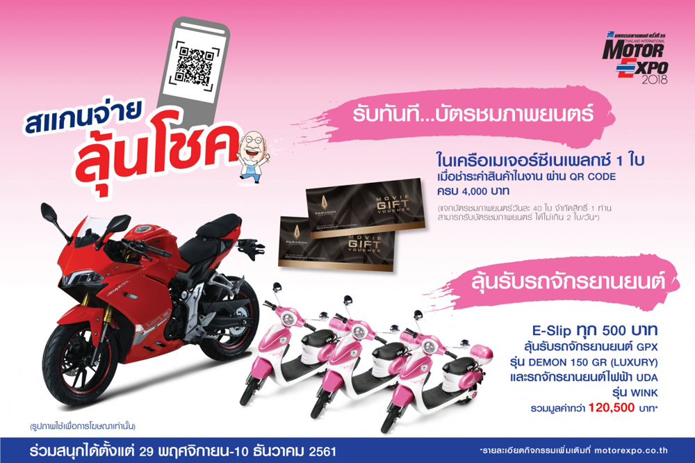 “สแกนจ่าย…ลุ้นโชค ยิ่งสแกนจ่ายมากยิ่งมีสิทธิ์มาก” ซื้อสินค้าในงานตามมูลค่าที่กำหนด ชำระค่าสินค้าโดยสแกน QR CODE ผ่านระบบ Mobile Banking เท่านั้น และนำ E-slip มาลงทะเบียนผ่าน Motor Expo Application กรอกข้อมูลให้ครบถ้วน ลุ้นรับรางวัล 2 ต่อ ต่อที่ 1 รับฟรีบัตรชมภาพยนตร์ในเครือเมเจอร์ซีเนเพลกซ์ 1 ใบ มูลค่าใบละ 270 บาท แจกวันละ 40 รางวัล รวมมูลค่า 129,600 บาท ต่อที่ 2 ชิงรางวัล รถจักรยานยนต์ GPX รุ่น DEMON 150 GR (LUXURY) มูลค่า 63,800 บาท จำนวน 1 รางวัล และรถจักรยานยนต์ไฟฟ้า UDA รุ่น WINK (M400B) มูลค่า 18,900 บาท จำนวน 3 รางวัล