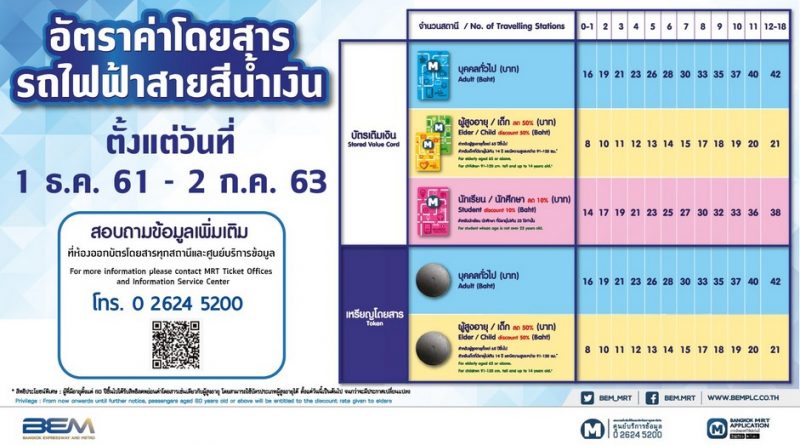MRT แจ้งอัตราค่าโดยสารใหม่ของรถไฟฟ้าสายสีน้ำเงิน