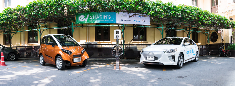 “EV Sharing+” เป็นโปรเจคที่ได้รับความร่วมมือจาก 5 พันธมิตร ได้แก่ บริษัท ฮุนได มอเตอร์ (ไทยแลนด์) จำกัด, มหาวิทยาลัยธรรมศาสตร์, บริษัท ฮ้อปคาร์ จำกัด, บริษัท เอฟโอเอ็มเอ็ม (เอเซีย) จำกัด และบริษัท อีโวลท์ เทคโนโลยี จำกัด โดยบริษัทฮุนได ถือเป็นแบรนด์อันดับต้น ๆ ที่ริเริ่มนำรถยนต์พลังงานไฟฟ้าเข้ามาทำตลาดในประเทศไทย ซึ่งขณะนี้ฮุนไดมีรถยนต์พลังงานไฟฟ้าจำหน่ายถึง 2 รุ่น ได้แก่ ไอออนิค และ โคน่า ซึ่งทั้ง 2 รุ่นขับเคลื่อนด้วยพลังงานไฟฟ้า 100% การเข้าร่วมโครงการนี้ ฮุนไดมีวัตถุประสงค์ที่จะเปิดโอกาสให้ผู้สนใจได้สัมผัสและทดลองขับรถยนต์พลังงานไฟฟ้า เทคโนโลยีที่ล้ำสมัยที่ไม่ไกลตัวอีกต่อไป ขณะเดียวกันเป็นการส่งเสริมด้านการลดมลพิษในอากาศอีกด้วย