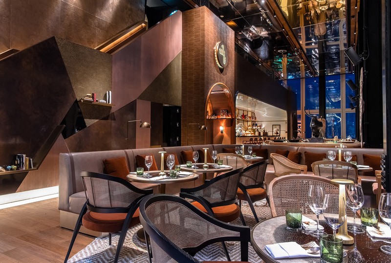 ด้วยการผสมผสานความหรูสง่างามแบบฝรั่งเศสกับความวิจิตรแบบไทย ประสบการณ์การเดินทางครั้งใหม่ได้เริ่มขึ้นแล้ว นับตั้งแต่ก้าวแรกผ่านโค้งประตูไม้ เผยให้เห็นการตกแต่งภายในที่ประณีตหรูหรา ประดับประดาด้วยโคมไฟเข้ากับหน้าต่างกระจกบานใหญ่สูงจากพื้นจรดเพดาน สัมผัสทิวทัศน์สวยอลังการสุดประทับใจ โดยทุกการตกแต่งในห้องอาหารแห่งนี้ล้วนเล่าเรื่องราวของนักเดินทางผู้รักการผจญภัย กล่าวขานผ่านปฏิมากรรมรูปหัววัวกระทิงที่ตั้งต้อนรับตระหง่าน หน้าปกหนังสือโบราณจากฝรั่งเศส เครื่องปั้นดินเผาชั้นดีจากญี่ปุ่น และลายเส้นอันพลิ้วไหวบนโถกระเบื้อง ก่อนจะนำเข้าสู่โถงบาร์หินอ่อนสีขาวบริเวณด้านใน ในขณะที่พื้นที่กลางแจ้งด้านนอกได้รับการเนรมิตให้เป็นบรรยากาศของป่าดงดิบ เต็มไปด้วยพืชพรรณนานาชนิด ให้ความรู้สึกราวกับป่าบนท้องฟ้า ซึ่งได้รับการออกแบบโดยทีมนักตกแต่งภายในระดับโลก Tristan Auer แห่ง Wilson Associates’ Paris Atelier ที่นำเสนอประสบการณ์ในการเดินทางออกจากเมืองใหญ่สู่โลกของการผจญภัยไม่รู้จบ พร้อมต้อนรับชาวไทยและนักเดินทางจากทั่วทุกมุมโลก