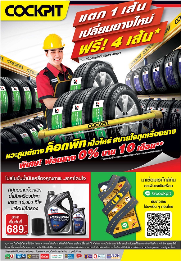 *โปรดตรวจสอบรายละเอียดเพิ่มเติมที่ศูนย์บริการค็อกพิท จีที ออโต้ไทร์ โทร.0-5641-0773, ศูนย์บริการค็อกพิท แม็กซ์ป้ายแดง โทร. 045-451-284 และศูนย์บริการค็อกพิท ไจแอ้นไทร์ สุวรรณภูมิ โทร.0-2360-8755-60 หรือติดตามข้อมูลเพิ่มเติมได้ที่ www.cockpit.co.th, www.facebook.com/Cockpitfc, แผนกลูกค้าสัมพันธ์ โทร.0-2636-1555 (กรุงเทพฯ และปริมณฑล) หรือ 1800-295-537 (ต่างจังหวัดโทรฟรี)