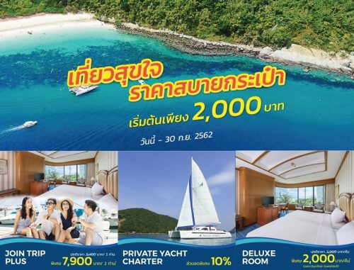 นอกจากนี้ยังมี Join Trip Plus โปรโมชั่นสุดคุ้มสำหรับ 2 ท่านที่มอบห้องพักหรู 1 คืนพร้อมทริปล่องเรือยอช์ท พาทุกท่านเที่ยวชม 3เกาะสวย ดำน้ำตื้น รวมทั้งอาหารบุฟเฟ่ต์และเครื่องดื่มบนเรือ ในราคาพิเศษเพียง 7,900 บาท จากปกติ 8,400 บาท