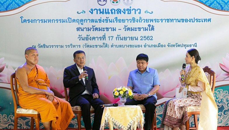 สำนักงานการท่องเที่ยวและกีฬาจังหวัดปทุมธานี จัดงานแถลงข่าว “โครงการมหกรรมเปิด ฤดูกาลแข่งขันเรือยาวชิงถ้วยพระราชทานของประเทศ สนามวัดมะขาม-มะขามใต้” โดยมี ดร.พินิจ บุญเลิศ ผู้ว่าราชการจังหวัดปทุมธานี ประธานพิธีแถลงข่าว พระครูสมุห์วัชระ ภัททธัมโม ผู้ช่วยเจ้าอาวาสวัดระฆังโฆสิตาราม ผู้แทนการจัดงานวัดมะขามใต้ นายมหิทธร โคกเกษม ท่องเที่ยวและกีฬาจังหวัดปทุมธานี ร่วมแถลงข่าว พร้อมด้วย พระมงคล วโรปการ (หลวงพ่อชำนาญ อุตฺตมปญฺโญ) ที่ปรึกษา เจ้าคณะจังหวัดปทุมธานี เจ้าอาวาสวัดชินวราราม วรวิหาร หัวหน้าส่วนราชการ และพรีเซ็นเตอร์งาน โดยมีคุณอั๋น ชยพล บุนนาค คุณมิ้นท์ บารมิตา สาครจันทร์ และดารานักแสดงที่มาร่วมงาน คุณมะนาว ศรศิลป์ มณีวรรณ์ รวมถึง คุณกัญญาวีร์ หนูแก้ว มิสแกรนด์สมุทรสงคราม และประชาชนเข้าร่วมงาน
