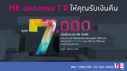 ME by TMB ผู้นำดิจิทัลแบงก์กิ้ง ฉลองครบรอบ 7 ปี ขยายเวลาแห่งความสุขในการมอบสิทธิพิเศษ ตั้งแต่วันนี้ – 30 ก.ย.62 ให้ลูกค้า ME ที่ซื้อ ME SURE ประกันสะสมทรัพย์ 10/5 ชำระเบี้ยประกันสั้นเพียง 5 ปี แต่ได้รับความคุ้มครองชีวิตถึง 10 ปี พร้อมผลตอบแทนคืนทุกปี และสามารถลดหย่อนภาษีได้ ไม่ต้องตรวจสุขภาพ คุ้มครองทันที ซื้อง่ายผ่านแอปพลิเคชันได้ตลอด 24 ชม. โดยลูกค้าจะได้รับ