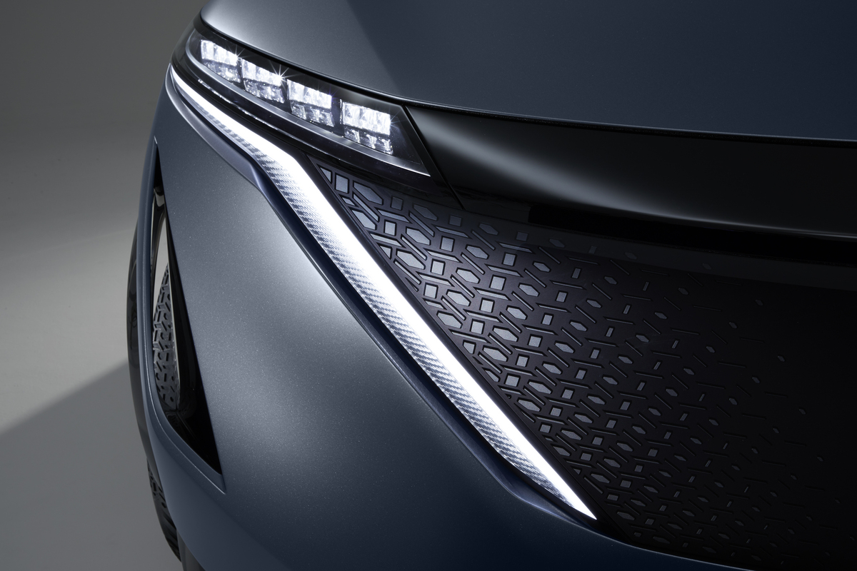 ความโดดเด่นเกิดขึ้นจากแนวคิดที่ “ปราดเปรียว” “ลื่นไหล” และ “เซ็กซี่” ซึ่งรูปลักษณ์ภายนอกของนิสสัน อริยะ คอนเซ็ปต์ แสดงถึงตัวอย่างสำคัญของแนวคิดการออกแบบใหม่ ทั้งซุ้มล้อหน้าที่กว้าง ไฟหน้า LED ที่เพรียวบาง รวมถึงกระจังหน้า ที่สง่างามด้วยโลโก้พิเศษแบบเรืองแสงของนิสสัน กระจังหน้า หรือ โล่ดังกล่าวถูกออกแบบด้วยรูปลักษณ์ทรงเรขาคณิตอย่างพิถีพิถัน ซึ่งจะปรากฏสู่สายตาเมื่อ V-motion เอกลักษณ์แบบรถยนต์พลังงานไฟฟ้าสว่างขึ้น