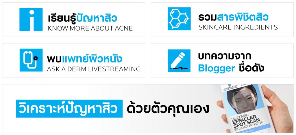 นอกจากนั้น Acne Community ยังได้รวมนวัตกรรมล่าสุดของลาโรช โพเซย์ไว้ด้วย คือ Effaclar SPOTSCAN ซึ่งเป็น “นวัตกรรมวิเคราะห์ปัญหาสิวที่แม่นยำ และทันสมัยที่สุด” จาก La Roche Posay ที่นำสุดยอดนวัตกรรมมาใช้วิเคราะห์ระดับความรุนแรงของสิว และปัญหาสิวได้อย่างแม่นยำ พัฒนาโดย Artificial Intelligence ร่วมมือกับแพทย์ผิวหนังจากทั่วโลก ด้วยการวิเคราะห์ภาพผู้หญิงและผู้ชายหลายพันภาพ ที่มีประเภทผิวและระดับความรุนแรงของสิวที่แตกต่างกัน แล้วพัฒนาจนได้เป็น Effaclar SPOTSCAN ทดลองกดเข้าไปวิเคราะห์สิวบนผิวหน้า แล้วลงทะเบียน พร้อมรับผลิตภัณฑ์ตัวอย่าง ส่งถึงบ้านฟรี