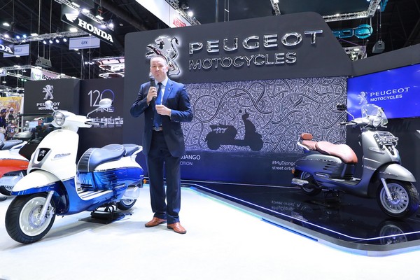 คุณกวิน ร่วมใจพัฒนกุล กรรมการบริหาร ฝ่ายผลิตภัณฑ์ บริษัท ไดนามิคมอเตอร์ (ประเทศไทย) จำกัด เปิดเผยว่า “สำหรับ PEUGEOT Motocycles แบรนด์ดังระดับตำนานที่มีประวัติยาวนานกว่า 120 ปี กับการร่วมงาน Motor Expo 2019 (มหกรรมยานยนต์ ครั้งที่ 36) ในครั้งนี้ เราได้มีการนำรถรุ่น DJANGO 150 มาจัดแสดงให้ทุกท่านได้มาร่วมสัมผัสตัวจริงกันครบทุกสีสันที่มีจำหน่ายอยู่ ณ ขณะนี้ ได้แก่ สีขาว-น้ำเงิน, สีขาว-ส้ม, สีแดง, สีน้ำเงิน และ สีเทา พร้อมทั้งจัดแสดงรถที่มีการติดตั้งอุปกรณ์ตกแต่งแท้ ที่นำเข้าจากบริษัทแม่ในต่างประเทศให้ได้ชม เพื่อให้เป็นแนวทางในการตกแต่งรถแก่ลูกค้าอีกด้วย”
