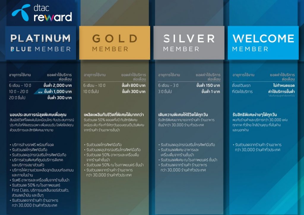 - Platinum Blue Member มอบประสบการณ์สุดพิเศษเพื่อคุณ กลุ่มลูกค้าที่ใช้บริการตั้งแต่ 1,000 บาทต่อเดือนขึ้นไปและใช้บริการดีแทค นานติดต่อกันกว่า 10 ปี กลุ่มนี้จะได้รับสิทธิประโยชน์ สิทธิพิเศษ และส่วนลดที่คุ้มค่ามากกว่าเดิม เช่น บริการล้างรถฟรีพร้อมที่จอดรถในห้างสรรพสินค้า ชั้นนำทั่วประเทศ ส่วนลดสำหรับซื้อโทรศัพท์มือถือ บริการรวดเร็วก่อนใคร (Priority services) บริการช่วยเหลือฉุกเฉินเกี่ยวกับรถยนต์ (Roadside Assistance) และรับเครื่องดื่มฟรี ข้อมูลเพิ่มเติม http://dtac.co.th/s/Platinum