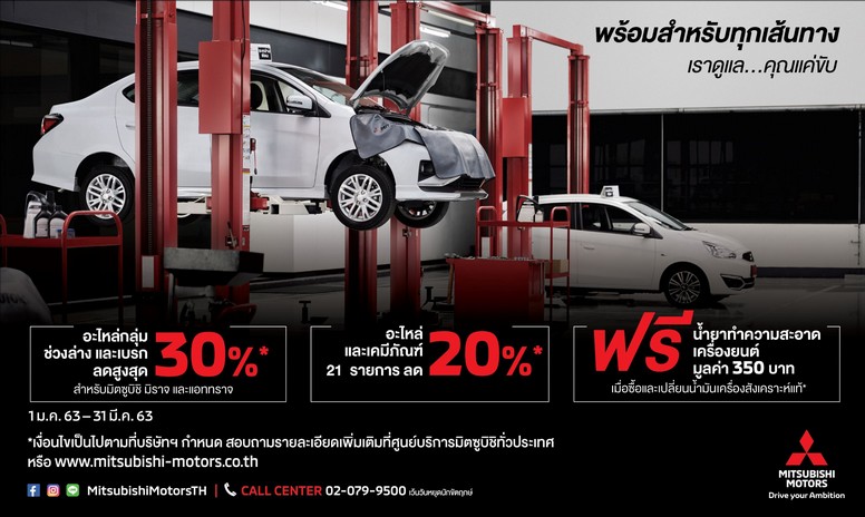 บริษัท มิตซูบิชิ มอเตอร์ส (ประเทศไทย) จำกัด มุ่งมั่นส่งมอบประสบการณ์การขับขี่อย่างไร้กังวลด้วยการบริการภายใต้สโลแกน “เราดูแล คุณแค่ขับ” อย่างต่อเนื่อง พร้อมกันนี้ยังได้จัดรายการส่งเสริมการขายพิเศษเพื่อการดูแลรักษารถยนต์จนถึงวันที่ 31 มีนาคม 2563 ที่ศูนย์บริการมิตซูบิชิ ทั่วประเทศ