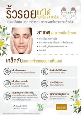ริ้วรอย ตัวร้ายทำลายความสวย-หล่อของใครหลาย ๆ คน ยิ่งเวลาผ่านไป อายุเพิ่มมากขึ้น ริ้วรอยบนใบหน้าก็ทำร้ายเรามากขึ้นเช่นกัน และไม่ใช่แค่ผู้หญิงอย่างเดียวที่กังวลเรื่องนี้ แต่ทุกวันนี้ผู้ชายก็หันมาสนใจและให้ความสำคัญกับการดูแลผิวหน้าด้วยเช่นกัน กัลเดอร์มา ประเทศไทย ผู้ผลิตและจำหน่ายผลิตภัณฑ์เกี่ยวกับการดูแลผิวหนังและโรคผิวหนังรวมไปถึงด้านสุขภาพความงาม จึงได้เชิญแพทย์ผู้เชี่ยวชาญ นายแพทย์อภิรุจ ทองวัฒน์ แพทย์ผู้เชี่ยวชาญด้านผิวพรรณและความงาม จากเดอะคลีนิกค์ (THE KLINIQUE) มาเผยเคล็ดลับต้านริ้วรอย ดูแลผิวให้ยกกระชับและอ่อนเยาว์ เหมือนวัยหนุ่มสาวอยู่เสมอ