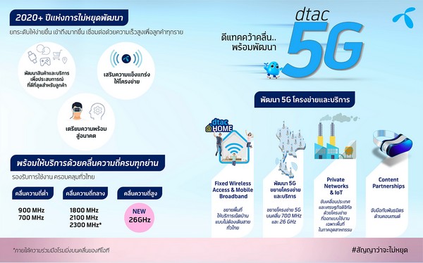 จากการประมูลคลื่นความถี่ล่าสุด ดีแทคได้ถือครองคลื่น 5G ความถี่ย่าน 26GHz จำนวน 200 MHz ซึ่งสามารถนำมาให้บริการ 5G อินเทอร์เน็ตบอร์ดแบนด์ไร้สายประจำที่ ซึ่งจะทำความเร็วได้สูงสุดราว 1Gbps ในพื้นที่ที่กำหนดเปิดให้บริการ คาดว่าจะเปิดให้บริการราวครึ่งปีแรกของ ปี 2563