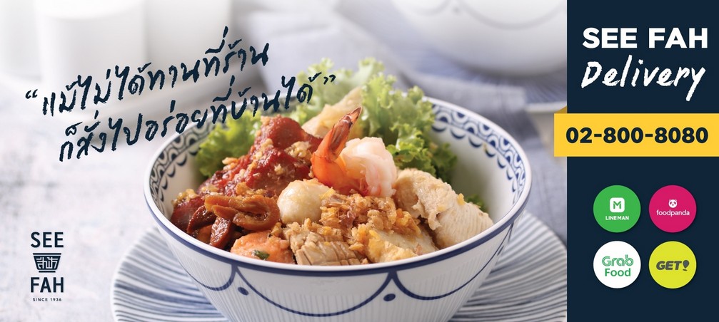 เพื่อความมั่นใจในความสะอาด ปลอดภัย เราพร้อมส่งความอร่อยถึงบ้านคุณทั่วกรุงเทพฯ และปริมณฑลผ่าน สีฟ้า เดลิเวอรี่ 0-2800-8080 และส่งผ่าน พาร์ทเนอร์ต่าง ๆ ได้แล้ววันนี้ ไม่ว่าจะเป็น GrabFood, Get, Line Man และ Foodpanda