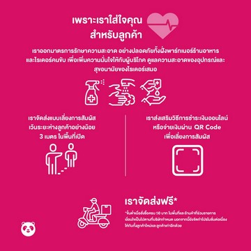 นอกเหนือจากขั้นตอนเหล่านี้ ฟู้ดแพนด้าจะยังตอกย้ำมาตรการรักษาความสะอาดเพื่อสร้างความมั่นใจให้กับผู้บริโภคอย่างสม่ำเสมอ โดยสื่อสารผ่านการวิดีโอออนไลน์ที่ให้ความรู้ด้านสุขอนามัยและการรักษาความสะอาดในการให้บริการของพาร์ทเนอร์ร้านอาหารและไรเดอร์ รวมทั้งยังสนับสนุนให้ลูกค้าทำการจ่ายเงินแบบไร้เงินสด (Cashless) เพื่อหลีกเลี่ยงการสัมผัสเงินสด และเลือกส่งแบบไร้สัมผัส (Contactless) ในการเว้นระยะห่างถึง 3 เมตรอีกด้วย