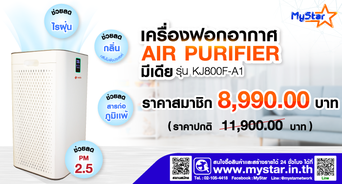 บริษัท มีเดีย เซ็นเตอร์ จำกัด ผู้ให้บริการทางด้านธุรกรรมการเงิน และคิดค้น พัฒนานวัตกรรมใหม่เพื่อคนไทย ภายใต้แบรนด์ “เติมดี” และ “SmartGo” โดย นางสาวเขมจิรา รตนดาวเรือง กรรมการผู้จัดการ ได้จัดโปร เครื่องฟอกอากาศ Media รุ่น KJ800F-A1 ราคาพิเศษสำหรับสมาชิก MyStar เพียง 8,990 บาท (จากปกติ 11,900 บาท) พร้อมได้รับ 1,800 PV สิทธิพิเศษนี้เฉพาะผู้ที่ทำการสั่งซื้อออนไลน์ผ่านเว็บไซด์ www.mystar.in.th เท่านั้น