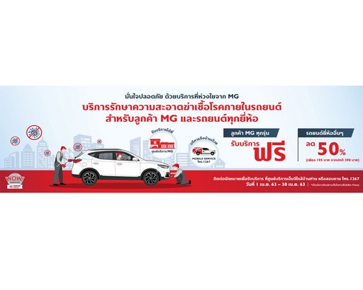 นายพงษ์ศักดิ์ เลิศฤดีวัฒนวงศ์ รองกรรมการผู้จัดการ บริษัท เอ็มจี เซลส์ (ประเทศไทย) จำกัด กล่าวว่า “จากสถานการณ์การแพร่ระบาดของไวรัสโควิด-19 ที่เกิดขึ้น ทางบริษัทได้คำนึงถึงความปลอดภัยและสุขภาพอนามัยของลูกค้าเป็นสำคัญ อีกทั้งเพื่อเป็นการตอบสนองมาตรการของภาครัฐในการลดหรือชะลอการแพร่ระบาดของไวรัสดังกล่าว ทางบริษัทฯ จึงได้จัดทำแคมเปญบริการหลังการขาย Wow! Service ด้วย “บริการรักษาความสะอาดและฆ่าเชื้อโรคภายในรถยนต์” ให้กับลูกค้าเอ็มจีโดยไม่มีค่าใช้จ่ายใดๆ และสำหรับรถยนต์ยี่ห้ออื่น ๆ ทางบริษัทมอบส่วนลดสูงสุดถึง 50% ในการเข้าใช้บริการดังกล่าว ที่โชว์รูมและศูนย์บริการเอ็มจีทั้ง 125 แห่งทั่วประเทศ”