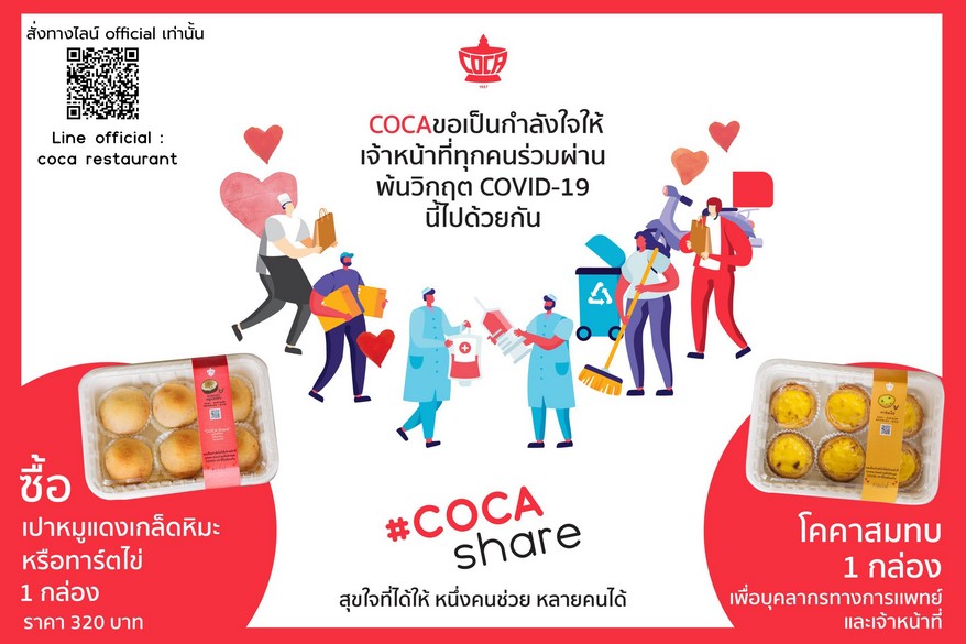 ร่วมส่งต่อกำลังใจ แชร์อาหารเพื่อสุขภาพ ไปให้ถึงมือคุณหมอ ในแคมเปญ “COCA Share สุขใจที่ได้ให้ หนึ่งคนช่วย หลายคนได้” เพียงซื้อ เปาหมูแดงเกล็ดหิมะ หรือ ทาร์ตไข่โคคา 1 กล่อง ในราคา 320 บาท ผ่าน Line Official: COCA Restaurant คลิก https://lin.ee/j4GXajU และบริการ COCA Delivery จากนั้นโคคา สุกี้ จะช่วยแชร์ความสุข ด้วยการร่วมบริจาค “เพิ่มอีก 1 กล่อง” ให้กับบุคลากรของ โรงพยาบาลสมเด็จพระปิ่นเกล้า กรมแพทย์ทหารเรือ รวมถึงอีกหนึ่งกลุ่มผู้เสียสละอย่าง ‘พนักงานทำความสะอาดพื้นที่สาธารณะ’ รอบโรงพยาบาล เพื่อให้แพทย์ พยาบาล บุคลากรทางการแพทย์ และเจ้าหน้าที่ทุกคน ได้ทานอาหารดีๆ ปรุงสดใหม่ ได้สุขภาพ จากทีม #cocashare แบ่งปันกำลังใจให้ทุกคน ร่วมผ่านพ้นวิกฤต COVID-19 นี้ไปด้วยกัน