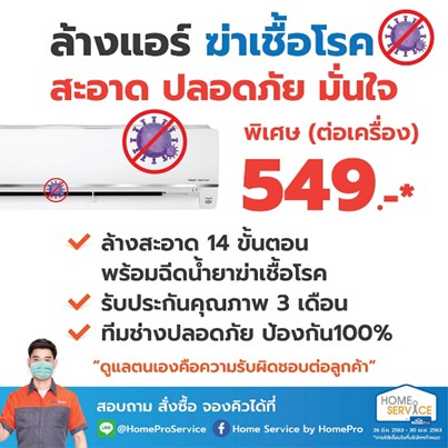 โฮมโปร ส่งทีมเซอร์วิสดูแลลูกค้าถึงหน้าบ้าน จัดการแอร์สะอาดไร้เชื้อโรค เพื่ออากาศดีไกลโควิด-19 กับ ‘โฮมโปร ล้างแอร์ ฆ่าเชื้อโรค’ บริการสุดพิเศษเฉพาะหน้าร้อนนี้ ตั้งแต่วันนี้ถึง 30 เมษายน 2563 ทำความสะอาดเครื่องปรับอากาศในบ้านได้อย่างมั่นใจ ด้วยทีมช่างมืออาชีพจาก Home Service ล้างด้วยกรรมวิธี 14 ขั้นตอน พร้อมฉีดน้ำยาฆ่าเชื้อโรค ช่วยให้เครื่องปรับอากาศทุกเครื่อง สะอาดทุกซอกมุม ปลอดภัยจากเชื้อโรค ฆ่าเชื้อแบคทีเรีย ประหยัดไฟ เย็นสบายยาวนาน เติมเต็มอากาศบริสุทธิ์ตลอดหน้าร้อน รับประกันคุณภาพ 3 เดือนเต็ม ในราคาพิเศษ เพียง 549 บาท (ต่อเครื่อง) เท่านั้น
