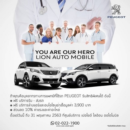 เปอโยต์ ไลอ้อน ออโตโมบิล ผู้แทนจำหน่ายรถยนต์ เปอโยต์ อย่างเป็นทางการในประเทศไทย มอบสิทธิ์พิเศษ สำหรับบุคลากรทางการแพทย์ ที่ใช้รถยนต์ เปอโยต์ ทุกรุ่น