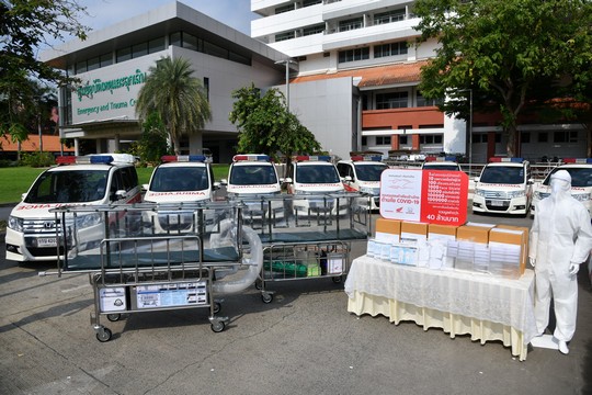 กองทุนฮอนด้าเคียงข้างไทย นำโดยนายพิทักษ์ พฤทธิสาริกร (ซ้าย) กรรมการผู้จัดการกองทุนฮอนด้าเคียงข้างไทย ส่งมอบเตียงเคลื่อนย้ายผู้ป่วยแบบแรงดันลบ 5 เตียง พร้อมบริการรถพยาบาล 1 คัน รถจักรยานยนต์พยาบาล 1 คัน ชุดป้องกันเชื้อ PPE 500 ชุด หน้ากาก Face Shield 50 ชิ้น และหน้ากากอนามัยแบบผ้า 5,000 ชิ้น ให้แก่โรงพยาบาลวชิรพยาบาล โดยมี รศ.นพ.อนันต์ มโนมัยพิบูลย์ (กลาง) อธิการบดีมหาวิทยาลัยนวมินทราธิราช และ รศ.นพ.ประยุทธ ศิริวงษ์ (ขวา) คณบดีคณะแพทย์ศาสตร์วชิรพยาบาล มหาวิทยาลัยนวมินทราธิราช รับมอบ