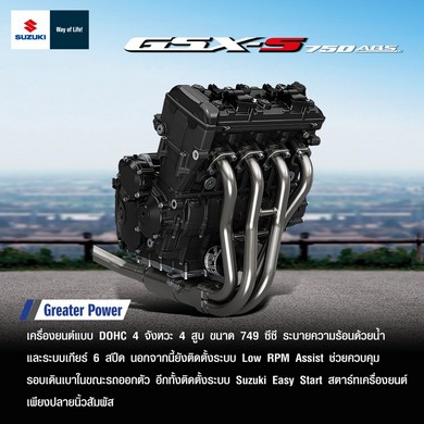 เพราะการขับขี่ยังต้องมีอะไรที่น่าค้นหาอีกมากมาย ซูซูกิ GSX-S750 ABS พร้อมที่จะถอดความเป็นนักล่าให้ออกมาอีกครั้ง ด้วยรูปทรงที่มีการถ่ายทอดมาจาก GSX-S1000 จึงมีความโดดเด่นและมีเอกลักษณ์เฉพาะตัว ไฟหน้าแบบมัลติรีเฟลกเตอร์ ไฟหรี่จะอยู่ทางด้านข้างของไฟหลักจึงทำให้มองดูคล้ายกับเป็นอสูรร้ายแห่งท้องถนน แต่เพียบพร้อมไปด้วยพลังของเครื่องยนต์แบบ DOHC 4 จังหวะ 4 สูบเรียง ขนาดความจุ 749 ซีซี. พร้อมการระบายความร้อนด้วยน้ำ ส่งกำลังด้วยระบบเกียร์ 6 สปีด พร้อมติดตั้งระบบ Low RPM Assist ช่วยควบคุมรอบเดินเบาในขณะออกตัว อีกทั้งยังได้ติดตั้งระบบ Suzuki Easy Start ที่จะช่วยให้การสตาร์ทเครื่องยนต์ทำได้ง่ายมากยิ่งขึ้น ความทรงพลังของเครื่องยนต์ที่มาพร้อมกับเทคโนโลยีที่จะช่วยให้การขับขี่ได้สนุกและท้าทายมากขึ้นไม่ว่าจะเป็น