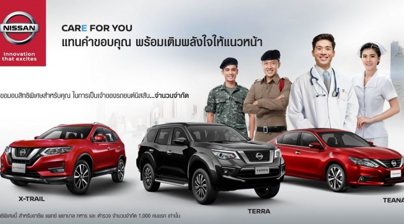 นิสสัน มอบข้อเสนอรถยนต์กลุ่มพรีเมี่ยมราคาพิเศษ ทั้ง 3 รุ่น สำหรับบุคลากรทางการแพทย์ และกลุ่มลูกค้าอาชีพพิเศษ ภายใต้โครงการ “Care For You แทนความห่วงใยจากนิสสัน” เพื่อสนับสนุนบุคลากรผู้ปฏิบัติหน้าที่สำคัญในช่วงการระบาดของไวรัสโควิด-19