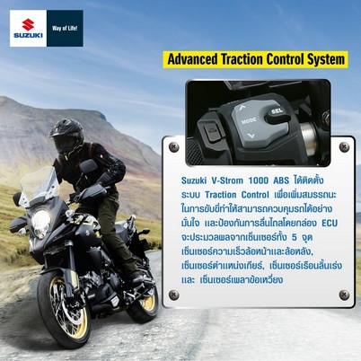 นอกจากนั้น Suzuki V-Strom 1000 Series ยังได้ติดตั้งระบบ Traction Control ที่จะช่วยให้การขับขี่ให้ปลอดภัยมากยิ่งขึ้น โดยเฉพาะในสภาพพื้นผิวที่เปียกลื่น สามารถตั้งค่าการทำงานได้เพียงปลายนิ้วสัมผัส โดยกล่อง ECU จะประมวลการสั่งงานจากเซ็นเซอร์ทั้ง 5 จุด คือ เซ็นเซอร์ความเร็วที่ล้อหน้าและหลัง, เซ็นเซอร์ตำแหน่งเกียร์, เซ็นเซอร์เรือนลิ้นเร่ง และเซ็นเซอร์จากเพลาข้อเหวี่ยง ทำงานอย่างสัมพันธ์กัน