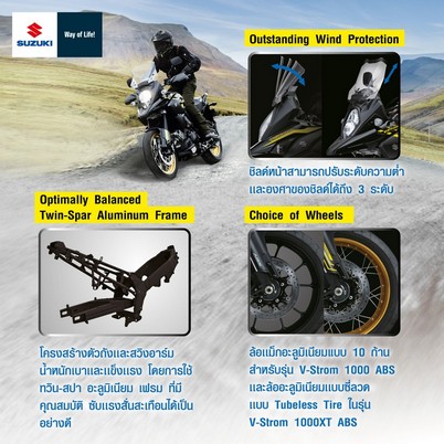 จะเดินทางทั้งทีได้รถบิ๊กไบค์ที่รู้ใจสักคันก็คงมีความสุขไม่น้อย…!! คงอยู่ในความฝันของนักเดินทางกับ Suzuki V-Strom 1000 Series ด้วยรูปทรงสไตล์ปากเหยี่ยว มีการถ่ายทอดมาจาก Suzuki DR-Big รถจักรยานยนต์แนว Adventure และ Suzuki DR-Z รถลุยทะเลทราย สนุกได้อย่างเต็มกำลังด้วยเครื่องยนต์แบบ V-Twin 90 องศา DOHC ขนาด 1,037 ซีซี. อีกทั้งยังใส่เทคโนโลยีที่ทันสมัย Suzuki Clutch Assist System (SCAS) ที่ช่วยให้การเปลี่ยนเกียร์ทำได้นุ่มนวลขึ้น อีกทั้งป้องกันคลัตช์ลื่น พร้อมด้วยการติดตั้งระบบ Low RPM Assist ช่วยให้การออกตัวทำได้นุ่มนวลมากขึ้น และยังมีโครงสร้างตัวถังอะลูมิเนียม แบบ Twin-Spar มีความแข็งแรง น้ำหนักเบา ช่วยในการซับแรงกระแทกได้ดีเยี่ยม ชิลด์ด้านหน้าสามารถปรับได้ถึง 3 ระดับ เพื่อป้องกันแรงลมปะทะให้กับผู้ขับขี่ ครบถ้วนด้วยการทำงานแผงหน้าปัด มีมาตรวัดความเร็วแบบอนาล็อกและดิจิตอล บอกการทำงานของตัวรถได้อย่างครบถ้วน ไม่ว่าจะเป็นอัตราการสิ้นเปลืองน้ำมันเชื้อเพลิง, ตำแหน่งเกียร์, นาฬิกา เป็นต้น