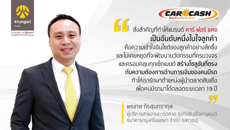 คาร์ ฟอร์ แคช เข้าใจทุกภาระหน้าที่ของหัวหน้าครอบครัว พร้อมเป็นอีกหนึ่งทางเลือกคุ้มค่าสำหรับคนมีรถ ที่ต้องการเพิ่มสภาพคล่องทางการเงิน ยืนหยัดเคียงข้างลูกค้า สู้ไปด้วยกันในทุกสถานการณ์ ลูกค้าสามารถสอบถามรายละเอียดเพิ่มเติมได้ที่ www.car4cash.com