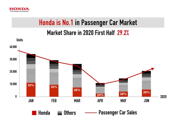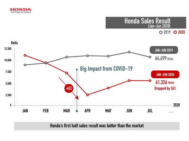 ในช่วงเดือนมีนาคมและเมษายนที่สถานการณ์โควิด-19 มีการแพร่ระบาดอย่างรุนแรง ส่งผลกระทบต่อยอดขายรถยนต์เป็นอย่างมาก แต่มีทิศทางที่ดีขึ้นด้วยยอดขายที่เริ่มฟื้นกลับขึ้นมาตั้งแต่ช่วงเดือนพฤษภาคม ส่งผลให้ 6 เดือนแรกของปีนี้ ฮอนด้ามียอดขายรวม 41,326 คัน มีส่วนแบ่งการตลาดอยู่ที่ 29.2% ซึ่งสามารถครองยอดขายเป็นอันดับหนึ่งในตลาดรถยนต์นั่งส่วนบุคคล แต่เมื่อเทียบกับช่วงเดียวกันของปีที่ผ่านมา มีอัตราลดลง 36.1% ซึ่งถึงแม้จะได้รับผลกระทบจากสถานการณ์โควิด-19 แต่ฮอนด้าก็ยังมีอัตราการเติบโตที่ดีกว่าตลาดรถยนต์ส่วนบุคคลโดยรวม