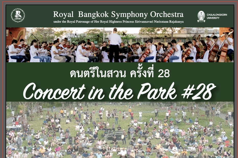 มูลนิธิรอยัลแบงค์คอกซิมโฟนีออร์เคสตร้า ในพระอุปถัมภ์สมเด็จพระเจ้าลูกเธอ เจ้าฟ้าสิริวัณณวรี นารีรัตนราชกัญญา ร่วมกับจุฬาลงกรณ์มหาวิทยาลัย โดยความสนับสนุนของ บุญรอดบริวเวอรี่ บี.กริม ขอเชิญชม Concert in the Park โดยไม่เสียค่าใช้จ่าย ใน วันอาทิตย์ 13 ธันวาคม เวลา 17.30 น. ณ อุทยาน 100 ปี จุฬาฯ