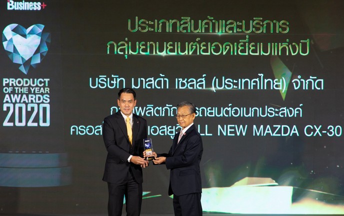 นายธีร์ เพิ่มพงศ์พันธ์ รองประธานบริหารฝ่ายการตลาดและรัฐกิจสัมพันธ์ บริษัท มาสด้า เซลส์ (ประเทศไทย) จำกัด เข้ารับมอบรางวัลสินค้าและบริการแห่งปี 2563 หรือ“Product of the Year Awards 2020” โดย All New Mazda CX-30 ได้รับรางวัลประเภทสินค้าและบริการกลุ่มยานยนต์ยอดเยี่ยมแห่งปี ในกลุ่มผลิตภัณฑ์รถยนต์อเนกประสงค์ครอสโอเวอร์เอสยูวี ตอกย้ำคุณภาพมาตรฐานความน่าเชื่อถือและตอบโจทย์ความต้องการของลูกค้าในประเทศไทยอย่างแท้จริง โดยมี ฯพณฯ นายชวน หลีกภัย ประธานรัฐสภาและประธานสภาผู้แทนราษฏร เป็นประธานในพิธีผู้มอบรางวัลอันทรงเกียรติในครั้งนี้ พร้อมด้วย นายมนู เลียวไพโรจน์ ประธานกรรมการ บริษัท เออาร์ไอพี จำกัด (มหาชน) และ ดร. บุญยิ่ง คงอาชาภัทร ผู้ช่วยคณบดีและหัวหน้าสาขาการตลาด วิทยาลัยการจัดการ มหาวิทยาลัยมหิดล ณ ห้องแกรนด์ บอลรูม โรงแรมเรดิสัน บลู พลาซ่า บางกอก