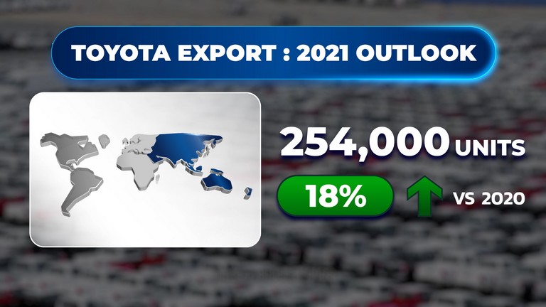 ทั้งนี้ สำหรับเป้าหมายการส่งออกรถยนต์สำเร็จรูปของโตโยต้าในปีนี้ คาดการณ์ว่าปริมาณการส่งออกจะอยู่ที่ 254,000 คัน เพิ่มขึ้น 18% จากปีที่แล้ว เนื่องจากความต้องการที่เพิ่มมากขึ้นจากภูมิภาคหลัก เช่น เอเชียและโอเชียเนีย