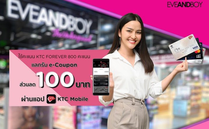 “เคทีซี” หรือ บริษัท บัตรกรุงไทย จำกัด (มหาชน) ชวนสมาชิกบัตรฯ ช้อปเครื่องสำอาง สินค้าความงามแบรนด์ดัง และน้ำหอมระดับโลกที่ “EVEANDBOY” พร้อมมอบสิทธิพิเศษผ่านการช้อปทุกช่องทาง ประกอบด้วยร้านค้า EVEANDBOY ทุกสาขา ช้อปออนไลน์ผ่านช่องทางเว็บไซต์ www.eveandboy.com และแอปพลิเคชัน EVEANDBOY เพียงใช้คะแนนสะสม KTC FOREVER 800 คะแนนแลกรับ รับ e-Coupon ส่วนลด 100 บาท ผ่านแอป KTC Mobile สำหรับชำระค่าสินค้าผ่านบัตรเครดิตเคทีซีครบ 500 บาทขึ้นไปต่อเซลส์สลิป หรือ ต่อรายการสั่งซื้อ ตั้งแต่วันที่ 1 กุมภาพันธ์ – 31 กรกฎาคม 2564