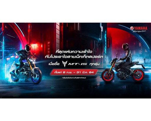 บริษัท ไทยยามาฮ่ามอเตอร์ จำกัด จัดโปรดีลสุดคุ้ม รับสิทธิ์ส่วนลดทันที 2 ต่อ เมื่อซื้อ YAMAHA MT-15 ทุกรุ่น ที่สุดแห่งความเร้าใจเอาใจชาวเน็กเก็ตสปอร์ต ตั้งแต่วันที่ 8 กุมภาพันธ์ – 31 มีนาคม 2564 รับทันทีต่อที่ 1 Gift Voucher ส่วนลดมูลค่า 7,000 บาท (รับสิทธิ์ได้ที่ร้านผู้จำหน่ายรถจักรยานยนต์ยามาฮ่าทุกสาขา) และต่อที่ 2 รับส่วนลดมูลค่า 2,000 บาท เมื่อซื้อกล่องติดท้ายรถที่ร้าน First Moto-Touring Shop (เฉพาะสินค้าที่ร่วมรายการ สอบถามข้อมูลเพิ่มเติม FB: First Moto-Touring Shop หรือโทร.09-0264-5639) *เงื่อนไขเป็นไปตามที่บริษัทฯ กำหนด และบริษัทขอสงวนสิทธิ์ในการเปลี่ยนแปลงรายละเอียดโดยไม่ต้องแจ้งให้ทราบล่วงหน้า