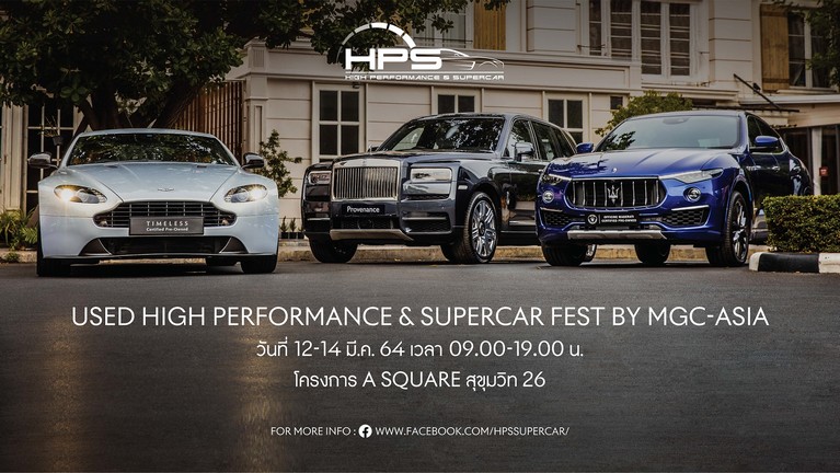 บริษัท มาสเตอร์ กรุ๊ป คอร์ปอเรชั่น (เอเชีย) จำกัด หรือ เอ็มจีซี-เอเชีย หนึ่งในผู้นำธุรกิจค้าปลีกยานยนต์ของไทย เอาใจผู้หลงใหลซูเปอร์คาร์ราคาคุ้มค่า จัดงาน ‘Used High Performance & Supercar Fest by MGC-ASIA’ ยกทัพซูเปอร์คาร์มือสองร่วม 20 คัน อาทิ โรลส์-รอยช์, แอสตัน มาร์ติน และ มาเซราติ มาจัดแสดงพร้อมจำหน่ายในราคาพิเศษ ระหว่างวันที่ 12–14 มีนาคม 2564 ณ โครงการ เอ-สแควร์ สุขุมวิท 26