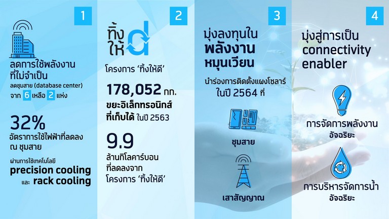 - การมุ่งพัฒนาเทคโนโลยีดิจิทัลเพื่อการใช้พลังงานอย่างมีประสิทธิภาพ(Connectivity-based Enabler) ในภาคธุรกิจอื่นๆ โดยอุตสาหกรรมโทรคมนาคมนั้นมีบทบาทในการชะลอการเปลี่ยนแปลงสภาพภูมิอากาศอย่างมีนัยสำคัญ ผ่านการใช้เทคโนโลยี machine-to-machine (M2M) หรือที่รู้จักในชื่อ ‘อินเทอร์เน็ตของสรรพสิ่ง (Internet of Things: IoT)’ และการเพิ่มบริการโทรคมนาคมไร้สาย (mobile connectivity) อีกทั้งยังมีศักยภาพในการยกระดับประสิทธิภาพการทำงานและลดการใช้ทรัพยากรธรรมชาติได้มหาศาล โดยเฉพาะในกลุ่มอุตสาหกรรมที่ใช้พลังงานสูงสุด ได้แก่ อาคารและที่อยู่อาศัย พลังงาน ขนส่ง เกษตรกรรม และภาคการผลิต โดยที่ผ่านมา ดีแทคได้ร่วมกับภาคอุตสาหกรรมต่างๆ ในการพัฒนารูปแบบทดสอบการใช้งาน อาทิ การพัฒนาระบบบริหารจัดการน้ำอัจฉริยะ และการพัฒนาระบบบริหารจัดการพลังงานไฟฟ้าอัจฉริยะ ในโรงงานต่าง ๆ และภาคธนาคารที่ช่วยสร้างเสถียรภาพทางพลังงานและวางแผนการใช้พลังงานได้อย่างมีประสิทธิภาพ
