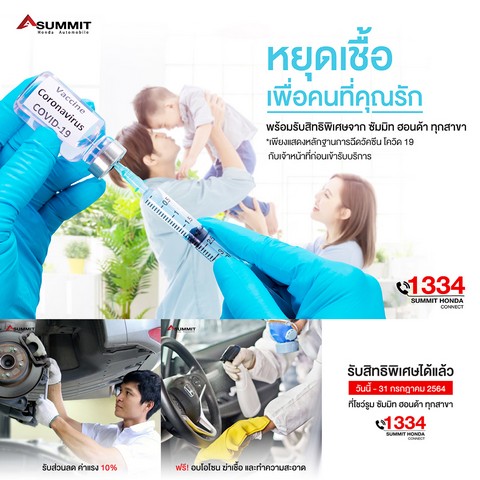 ซัมมิท ฮอนด้า มอบบริการพ่นน้ำยาฆ่าเชื้อ ทำความสะอาดห้องโดยสาร และอบโอโซน ฟรี! รวมถึงมีส่วนลดค่าแรง 10% และส่วนลดค่าเสียหายส่วนแรกสูงสุดถึง 100%* เมื่อเข้ารับบริการซ่อมสีและตัวถัง พร้อมแจกฟรี! น้ำยาหล่อลื่นอเนกประสงค์ ‘ทูนแนป 100’ (TUNAP 100) นำเข้าจากประเทศเยอรมนี