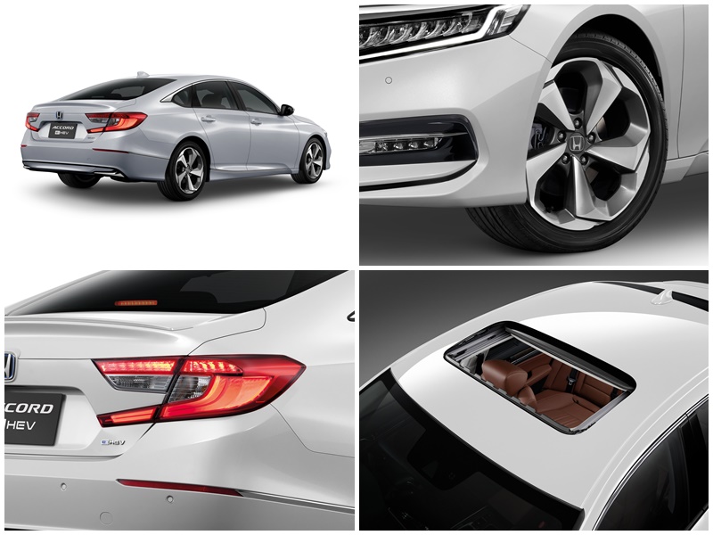 ตอกย้ำเอกลักษณ์อันโดดเด่นของยนตรกรรมไฮบริดใน แอคคอร์ด e:HEV ด้วย โลโก้ H Mark ตกแต่งกรอบสีฟ้า และสัญลักษณ์ e:HEV ที่ด้านท้าย มาพร้อมล้ออัลลอยดีไซน์สปอร์ตขนาด 17 นิ้วในรุ่น EL และขนาด 18 นิ้วในรุ่น e:HEV เสริมความสปอร์ตด้วยสปอยเลอร์หลัง และเพิ่มสุนทรียภาพในการเดินทางด้วยซันรูฟพร้อมระบบ One-Touch (เฉพาะรุ่น e:HEV TECH)