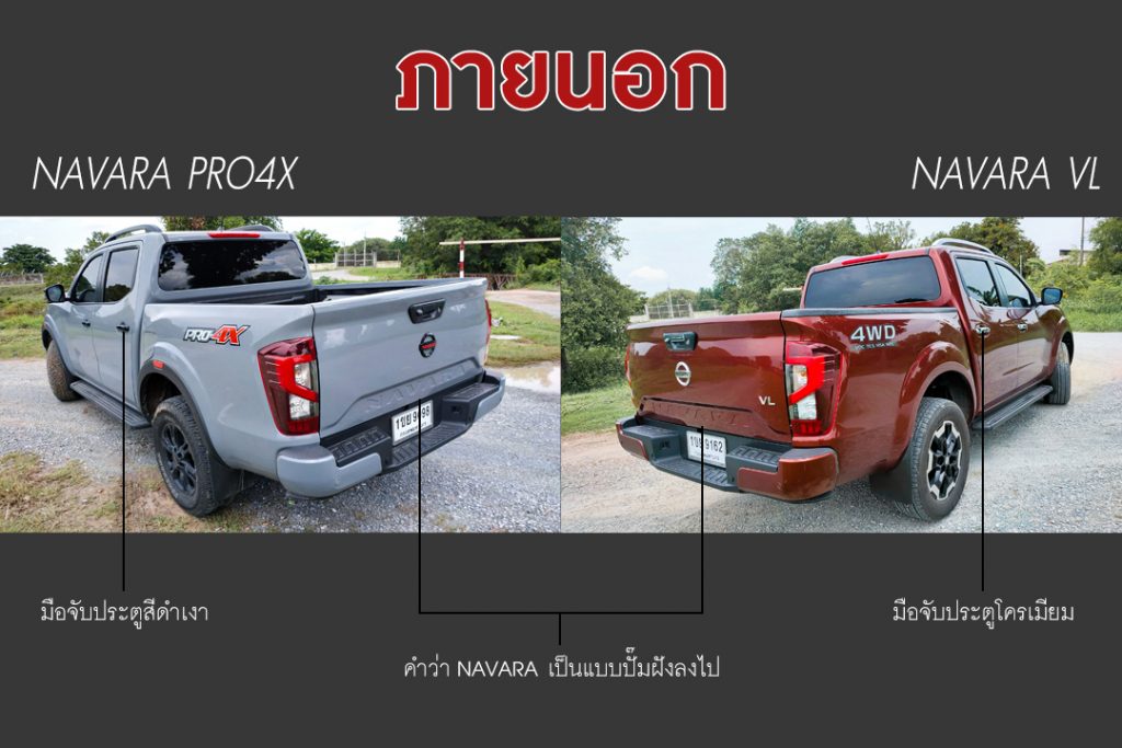 ด้านหลังนอกจากจะมีคำว่า Navara ปั๊มฝังลงไปเหมืนกันแล้ว ที่มือจับฝาท้ายข้างหลัง PRO4X จะเป็นสีดำด้านมีกล้องมองหลังติดมาให้ และด้านข้างฝาท้ายจะติดสติ๊กเกอร์บอกรุ่นรถอย่างชัดเจนด้วยคำว่า PRO4X ขนาดใหญ่ ส่วน VL 4X4 มือจับฝาท้ายจะยังคงความเป็นโครเมียม และสติ๊กเกอร์ด้านข้างบ่งบอกความเป็น 4WHEEL และระบบความปลอดภัยต่างๆ อย่าง VDC TCS HSA HDC