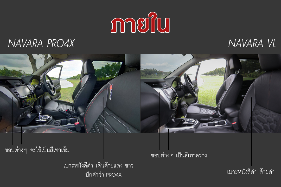 ทำให้ภายในทั้งสองรุ่นมีความแตกต่างกันไม่มากแต่ในส่วนของ PRO4X เน้นความดุดัน ในส่วนของ VL นั้นออกไปทางหรูหราแต่จุดที่รู้สึกได้จริงๆ คือเบาะปรับไฟฟ้า นอกจากนั้นให้ความรู้สึกที่ไม่ต่างกันมาก