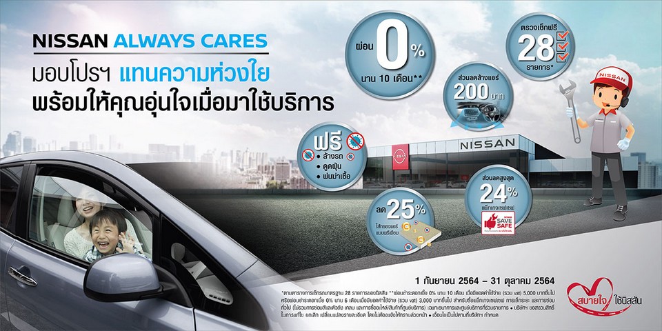 NISSAN ALWAYS CARES ให้บริการตรวจเช็คสภาพรถยนต์ฟรี 28 รายการ* บริการล้างรถ ดูดฝุ่น และพ่นน้ำยาฆ่าเชื้อภายในรถยนต์ รวมถึงใช้วัสดุแบบใช้แล้วทิ้งเพื่อคลุมป้องกันส่วนต่าง ๆ ภายในรถ โดยฉพาะจุดที่จะได้รับการสัมผัสโดยตรงจากช่างเทคนิค เมื่อนำรถยนต์นิสสันทุกรุ่นมารับบริการที่ศูนย์นิสสันทุกแห่งทั่วประเทศ และลูกค้าสามารถเลือกแพ็กเกจเช็คระยะ Save Safe ที่มีส่วนลดสูงสุดถึง 24% และสามารถเลือกบริการผ่อนชำระ ดอกเบี้ย 0% นานสูงสุด 10 เดือน เพื่อลดภาระค่าใช้จ่ายของลูกค้าได้